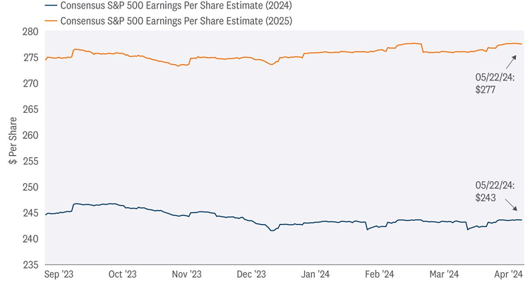 That suggests the current consensus estimate for S&P 500 EPS near $243 for 2024 may be achievable (we will likely raise our $235 estimate in our upcoming Midyear Outlook publication). AI is providing a boost, while the U.S. economy is showing signs of picking up after the soft first quarter, and earnings declines from healthcare and natural resources may reverse. The challenge is maintaining pricing power under disinflationary conditions. And currency could potentially be a headwind if the dollar strengthens.