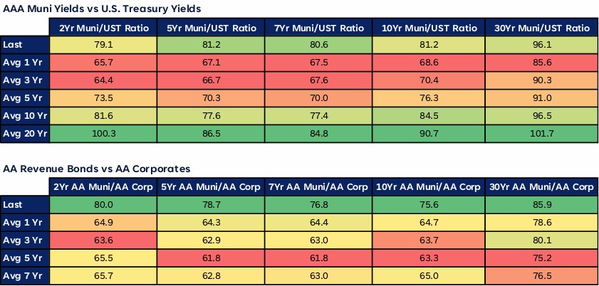 Moreover, municipal bonds currently compare favorably versus both Treasuries and corporate bonds. Measured through yield ratios — the municipal yield divided by a Treasury or corporate yield of similar maturity — we’re seeing valuations that suggest attractive entry points.